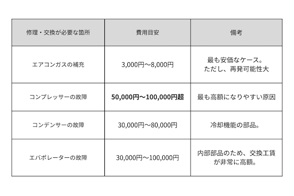- 車のエアコン修理は、原因によっては5万円〜10万円を超える高額な出費になることがあります。