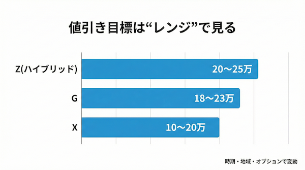 グレードごとの目標額(車両本体+オプション値引きの合計目安)は以下の通りです。