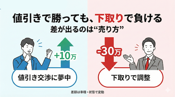 理由は単純で、値引き額にはディーラーが決めた上限がありますが、下取り額は「売り方」次第で20万〜30万円以上も変わる可能性があるからです。