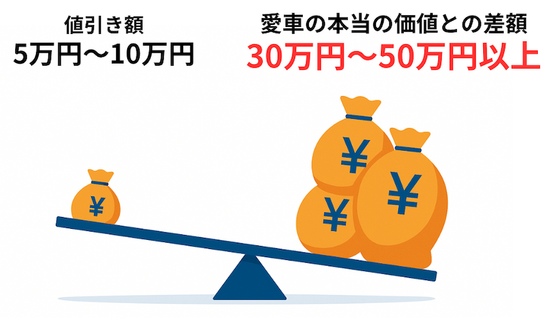 ディーラーは、あなたが左の「値引き額」という目先の数字に夢中になっている隙に、右の「下取り額」を本来の相場より低く提示することで、巧みに利益を確保しているのです。